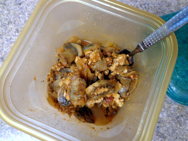 Leftovers from Sunday.  Whole-wheat penne topped with sautéed turkey, mushrooms, and onions in marinara sauce.