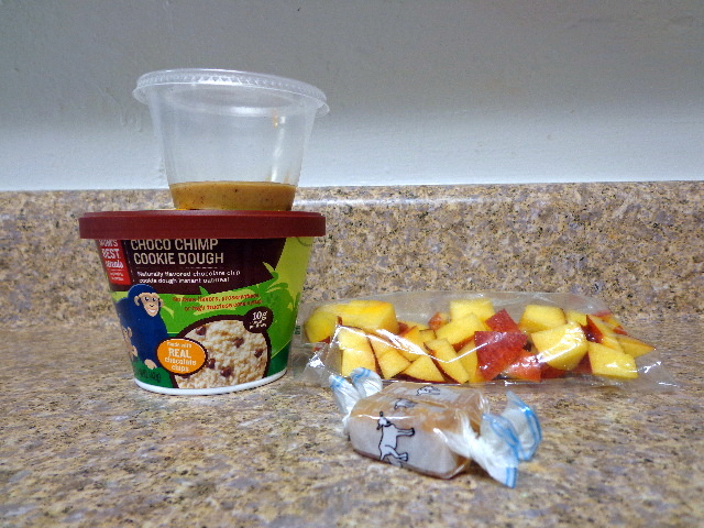 Chocolate chip oats with peanut butter and diced apricot stirred in.  Plus goats milk maple caramels on the side.
