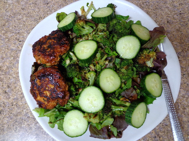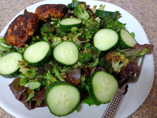 Arugula blend topped with TJ’s Asian Sesame Vinaigrette, sliced cucumber, and baked shredded Brussels sprouts and broccoli.  Two notes – 1) baking the shredded B sprouts is my new favorite thing; 2) I bought TJ’s Thai-style chili and lime cashews to put on the salads and they were so spicy even I couldn’t eat them.