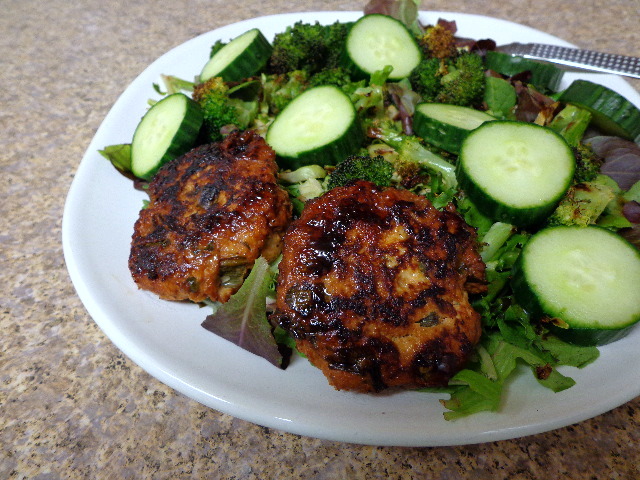 The patties were lean ground turkey with tons of parsley and green onions, soy sauce, rice vinegar, brown sugar, red curry paste, and ground ginger.  Cooked in coconut oil.