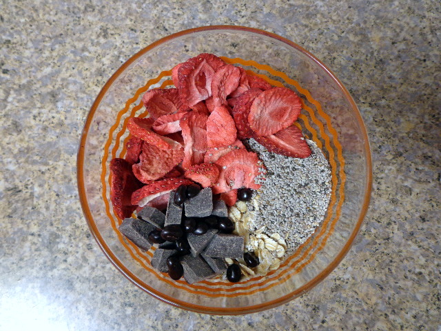 And oats from home.  With freeze-dried strawberries, chia seeds, chocolate covered cocoa nibs, and chocolate chunks.