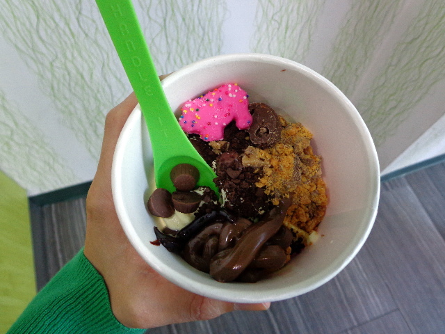 Frozen yogurt. Birthday cake topped with chocolate stuff and Nutella.