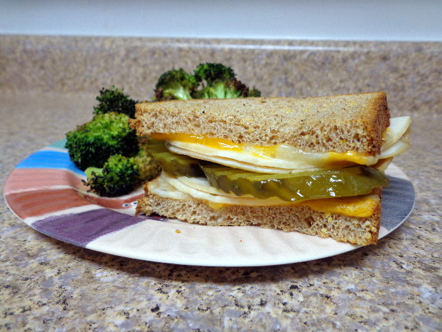 Multi-grain bread with smoked turkey, colby jack, mayo, and lots of pickles.