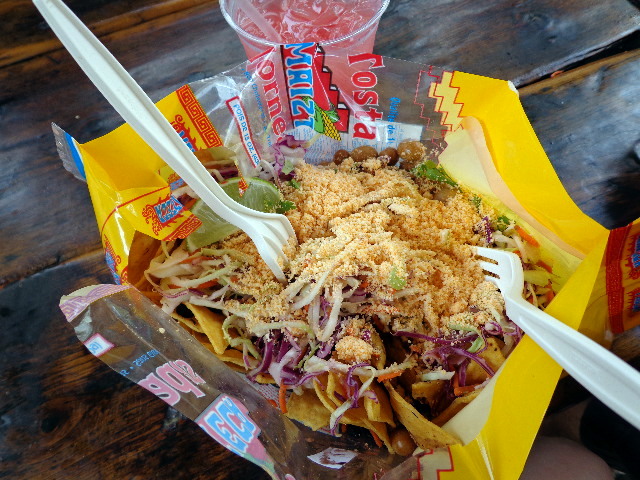 Plus we got Tostilocos, a big back of chips, black beans, seasoned cabbage, cojita, and Japanese peanuts.