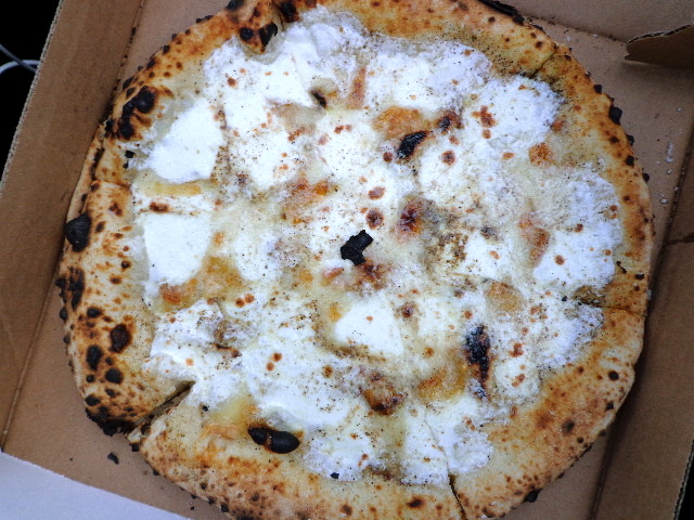 Pizza from Roberta’s. We will definitely be back! Cheesus Christ = mozzarella, taleggio, parmigiano, black pepper, and cream.