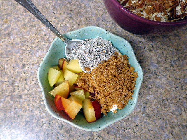 Plain Siggis + 2 types of plucot + chia seeds + crumbled graham cracker pie crust.