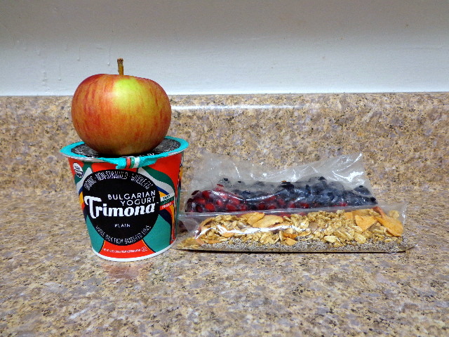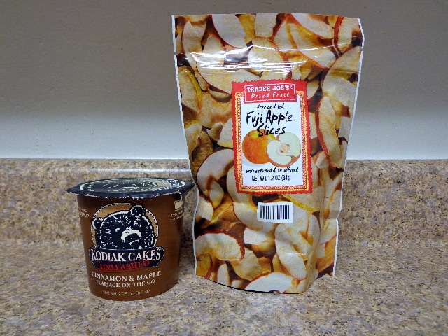 Kodiak flapjack on the go and TJ’s freeze-dried Fuji apple slices.