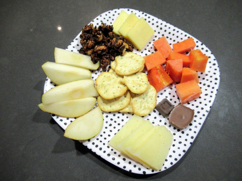 Cheese plates for dinner! Bartlett pear / homemade spiced candied walnuts / maple-smoked cheddar / papaya / durian chocolate and milk chocolate / Manchego / garlic naan crackers from Trader Joe’s.