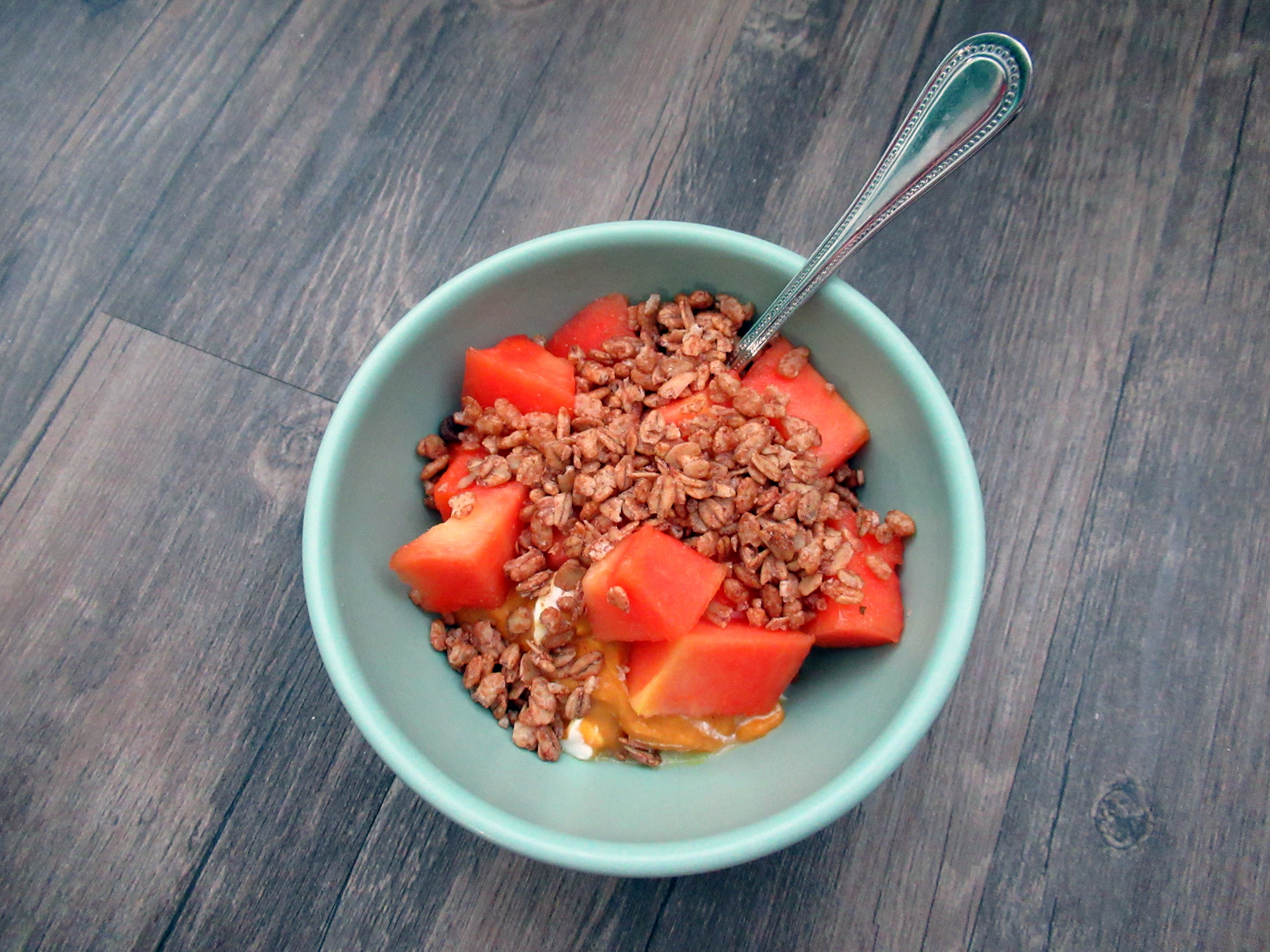Pumpkin Noosa with papaya and cocoa granola. Was pleasantly surprised by how well these three flavors paired together.