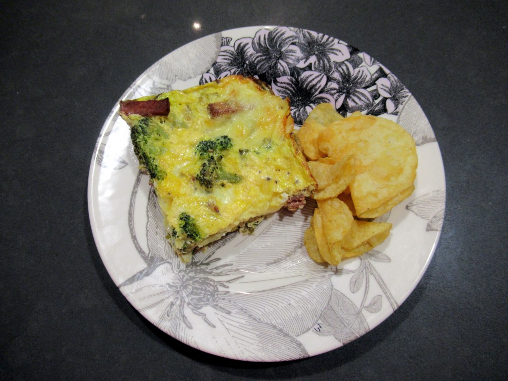 Egg casserole – with broccoli, green onion, shallot, TJ’s turkey summer sausage, and maple-smoked cheddar – plus beer cheese kettle chips. Inspired by this recipe.