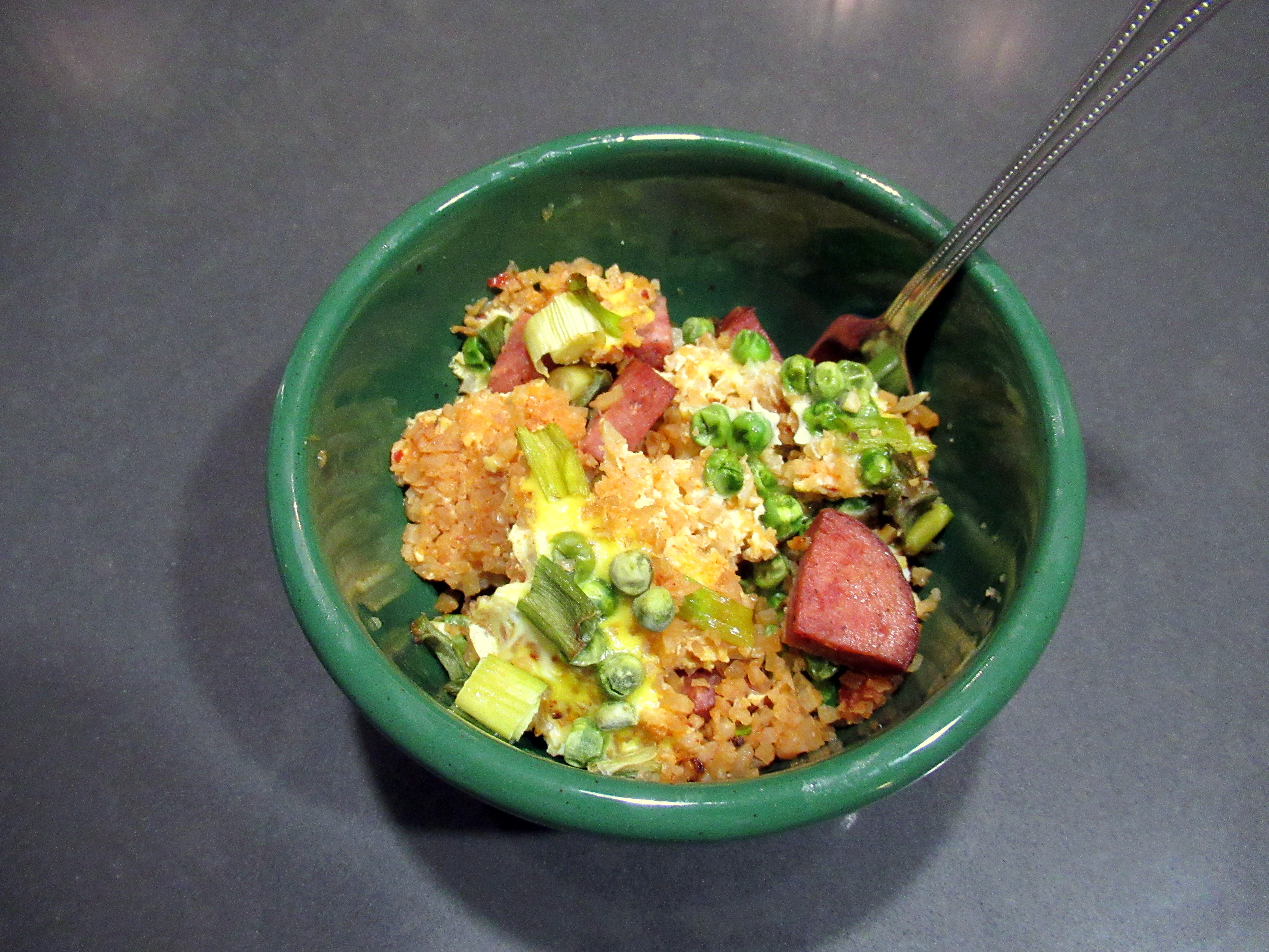 A great take on sheet-pan fried rice (loosely based on this method) with cauliflower rice (seasoned with soy sauce, fish sauce, rice vinegar, and gojuchang), peas, green onions, and sausage.
