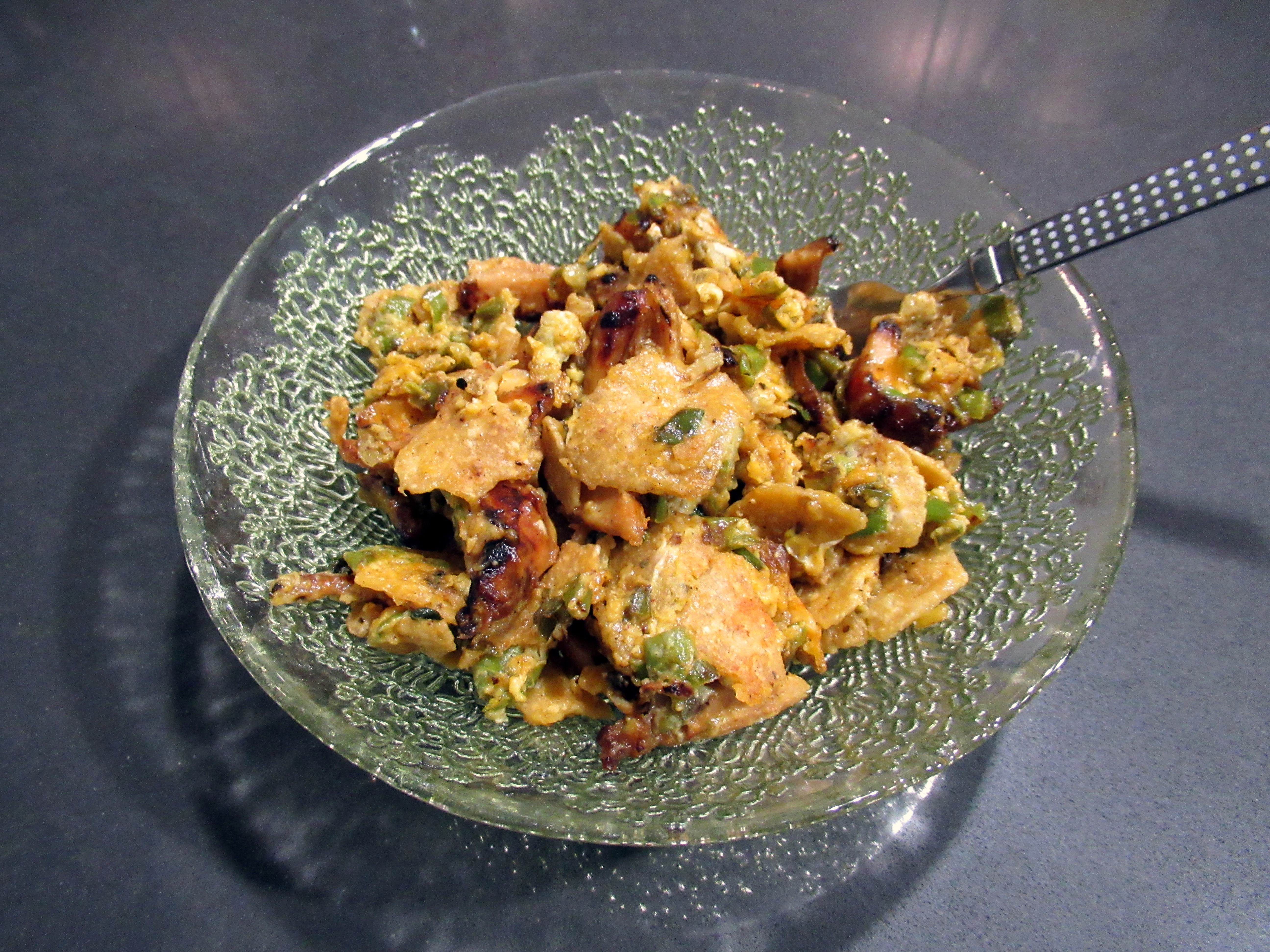 A take on migas with tortilla chips, chicken, cheddar, green onion, and shishito peppers.