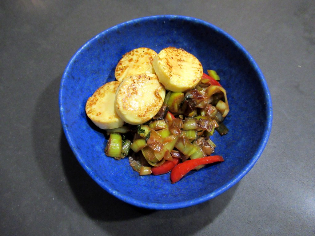 Stir-fried leek, bok choy, and red bell pepper with egg tofu.