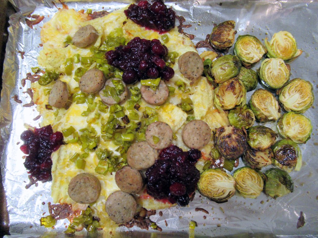 Thanksgiving nachos. This year we did Trader Joe’s horseradish and chives potato chips / shredded cheese / duck fennel sausage / shishito peppers / cranberry dressing. Plus roasted brussel sprouts on the side.