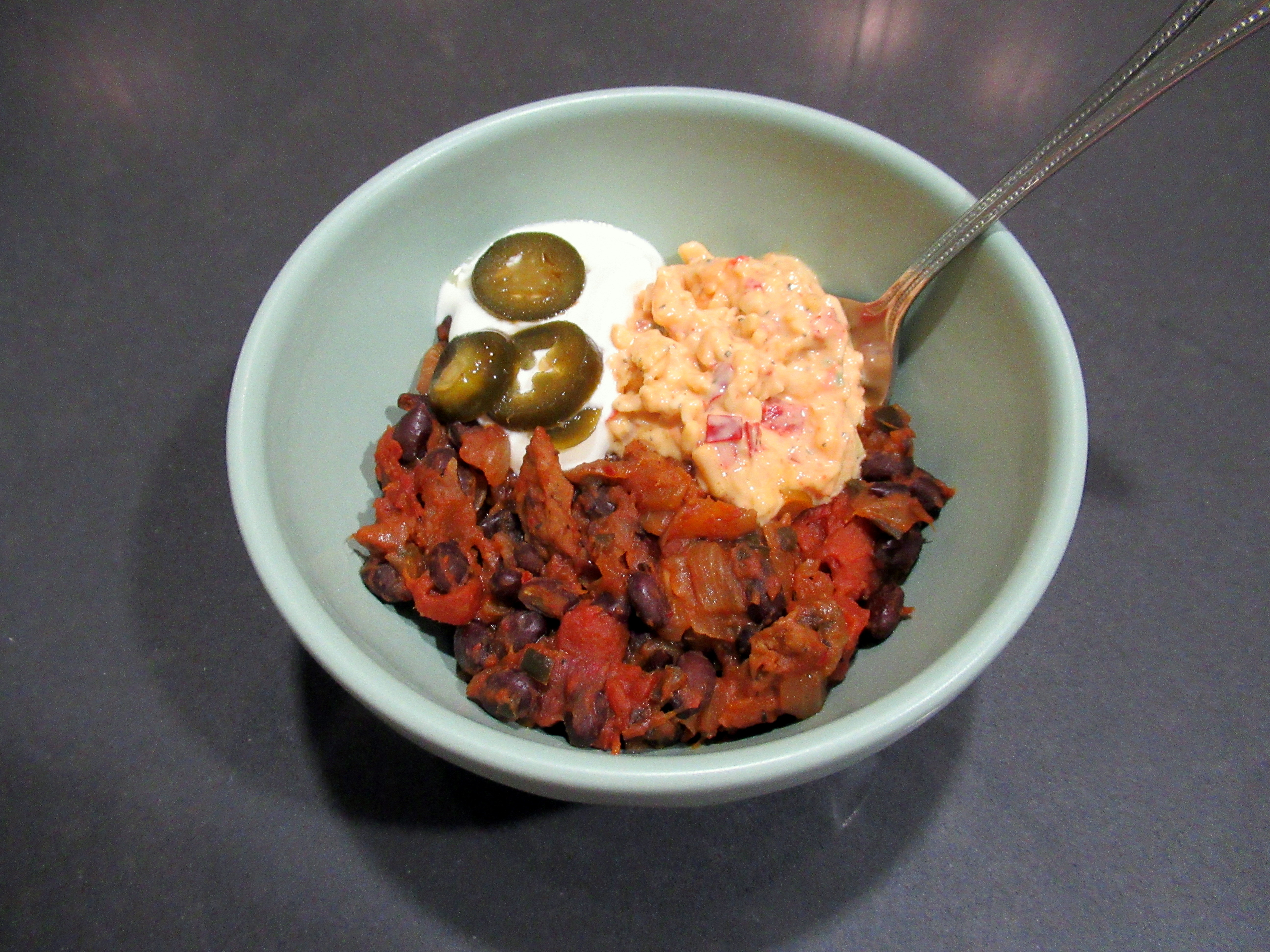 Homemade chili topped with sour cream, jalopenos, and pimento cheese. I used duck sausage, black beans, orange bell pepper, poblano pepper, sweet onion, diced tomato, spices, and beer.