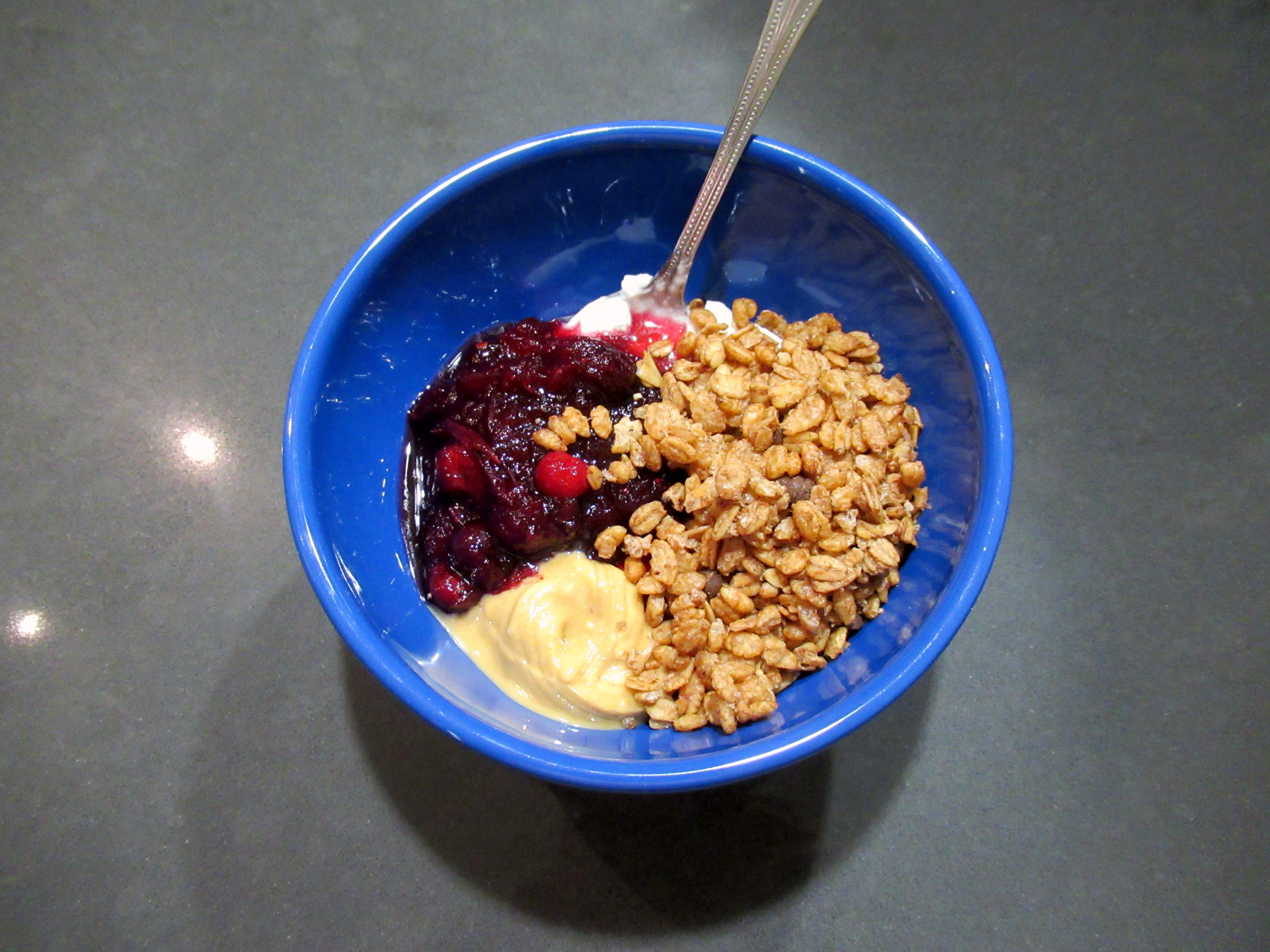 Yogurt bowl win. Plain Greek with peanut butter, cranberry dressing, and granola. Trader Joe’s cranberry dressing (the stuff in the refrigerated section, not the canned one) is the best in the game.