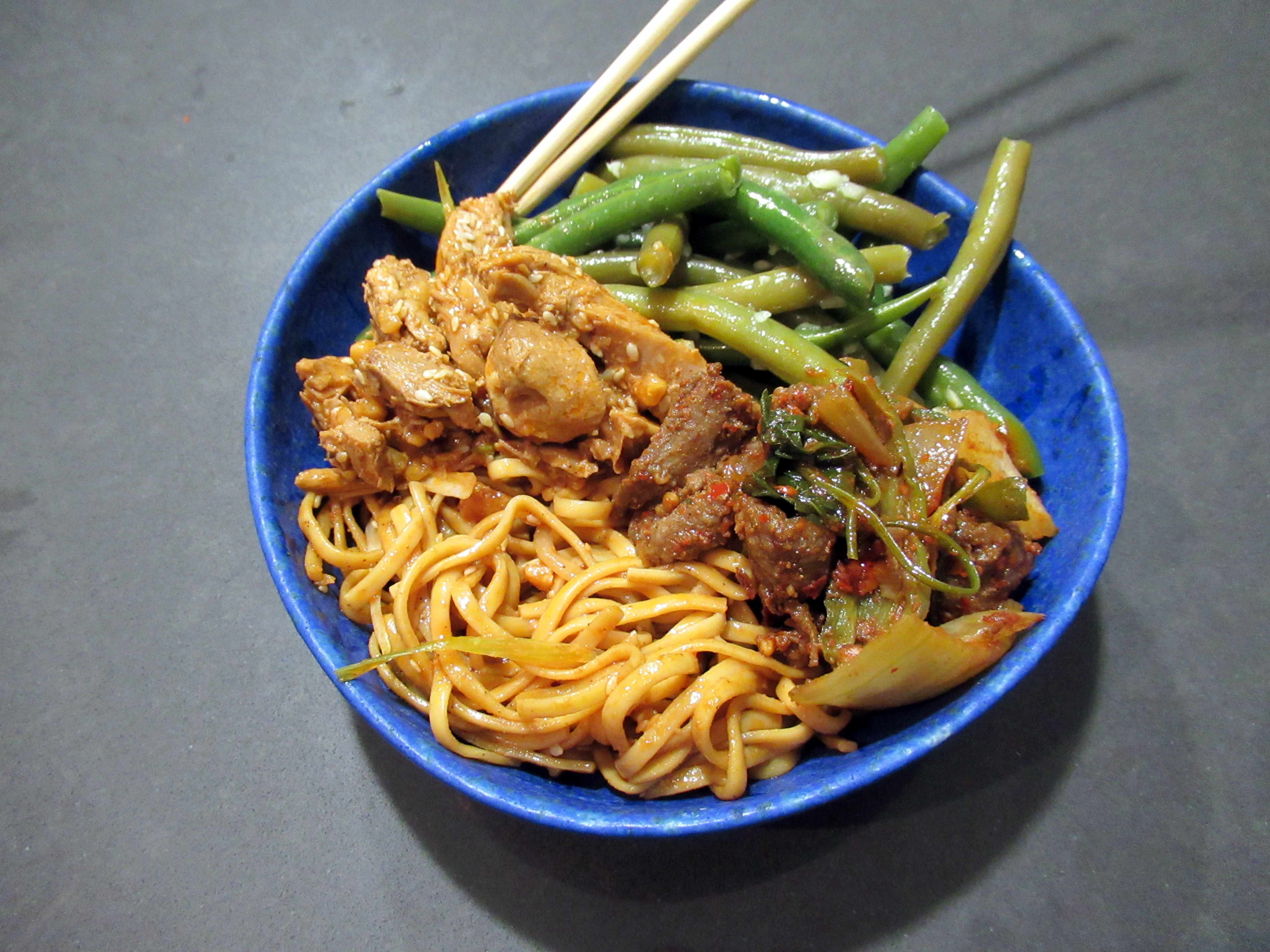 Chinese leftovers. Sichuan noodles, ginger green beans, chicken, and lamb.