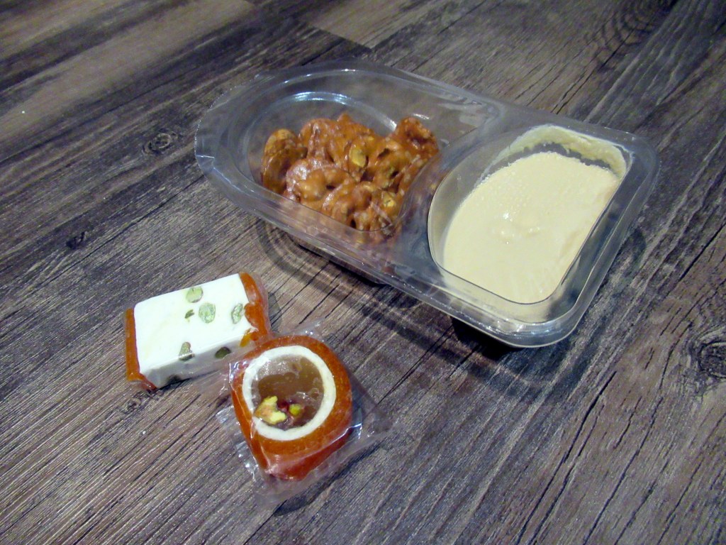 Hummus and pretzels with nougat and candied apricot candies my parents sent me.