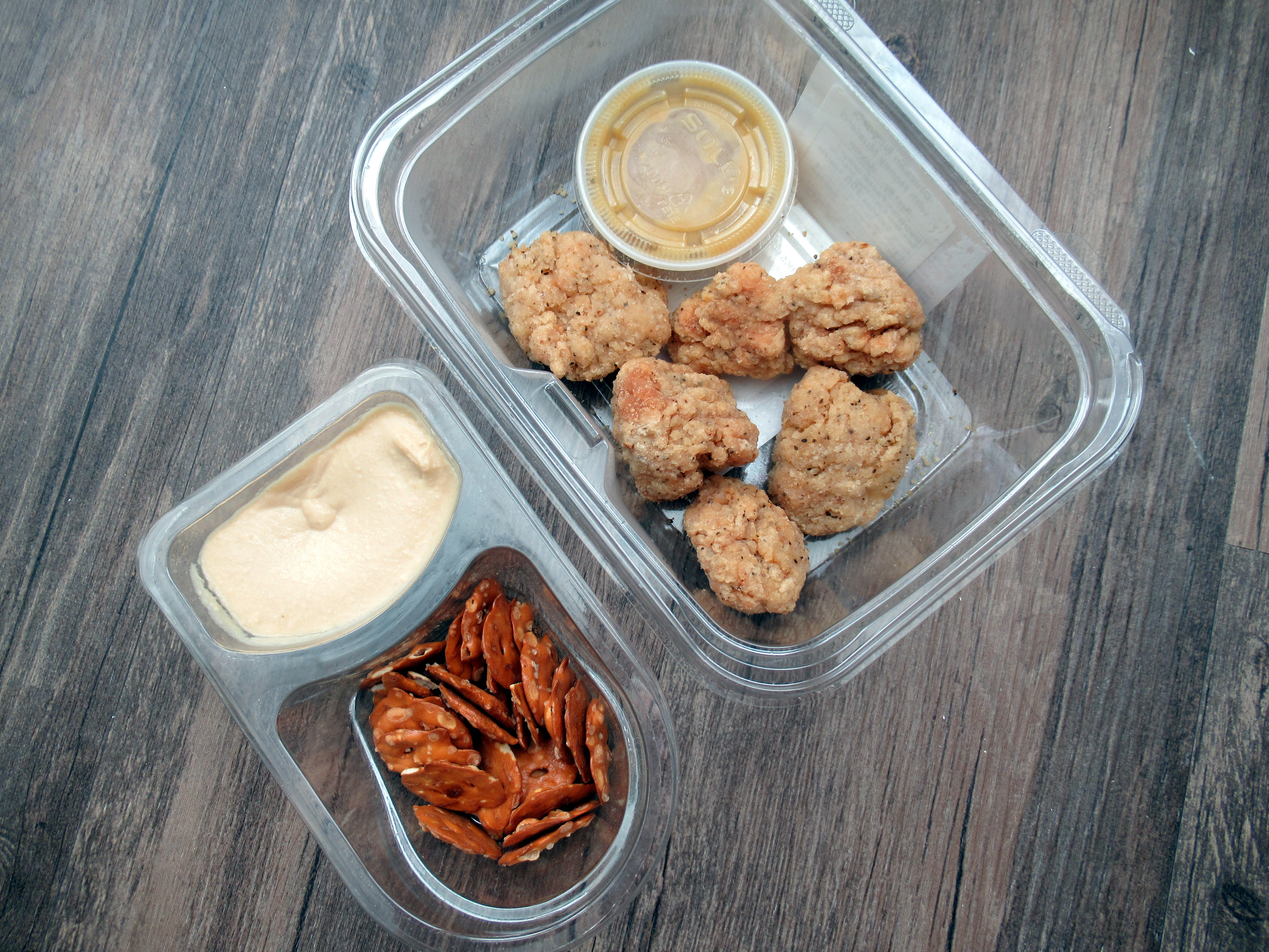 Pretzels with hummus + Whole foods chicken nuggets and honey mustard.