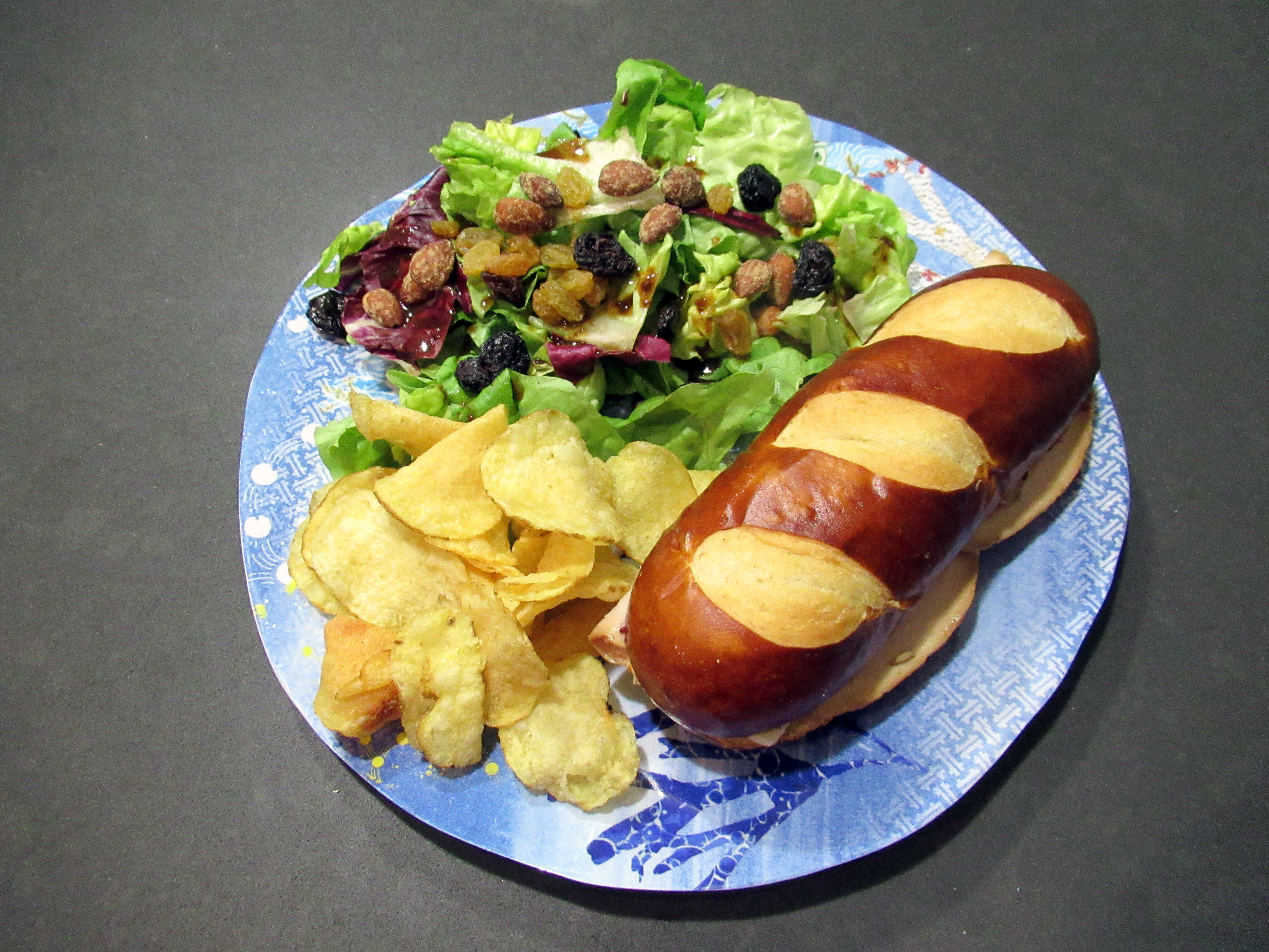 Smoked turkey sandwiches on pretzel rolls with strawberry jam, truffle mayo, and mozzarella. Plus potato chips and simple salads.