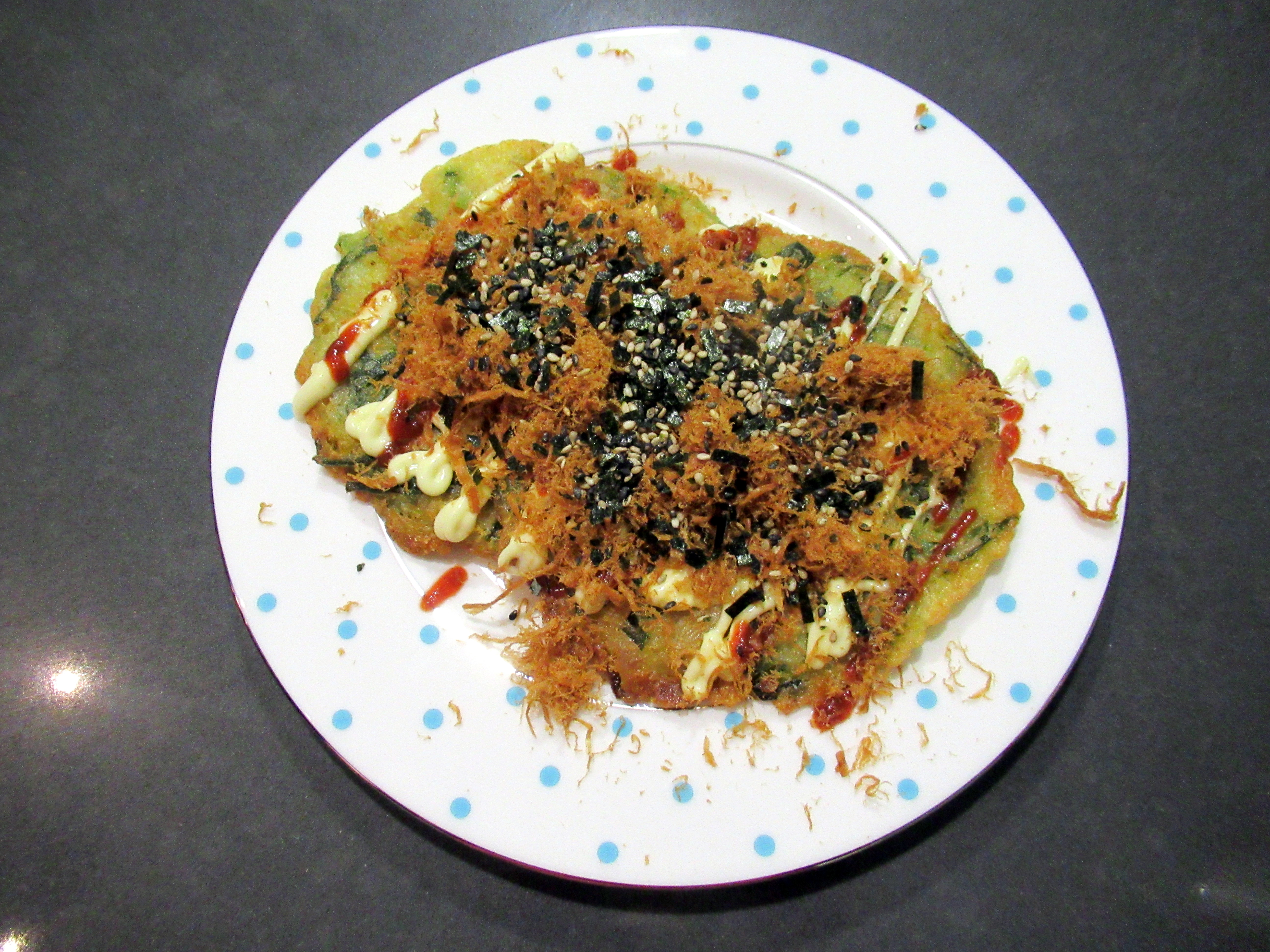 Trader Joe’s scallion pancakes topped with Kewpie, Sriracha, vegan pork floss, and furikake. <– reminder to myself to make this more often!