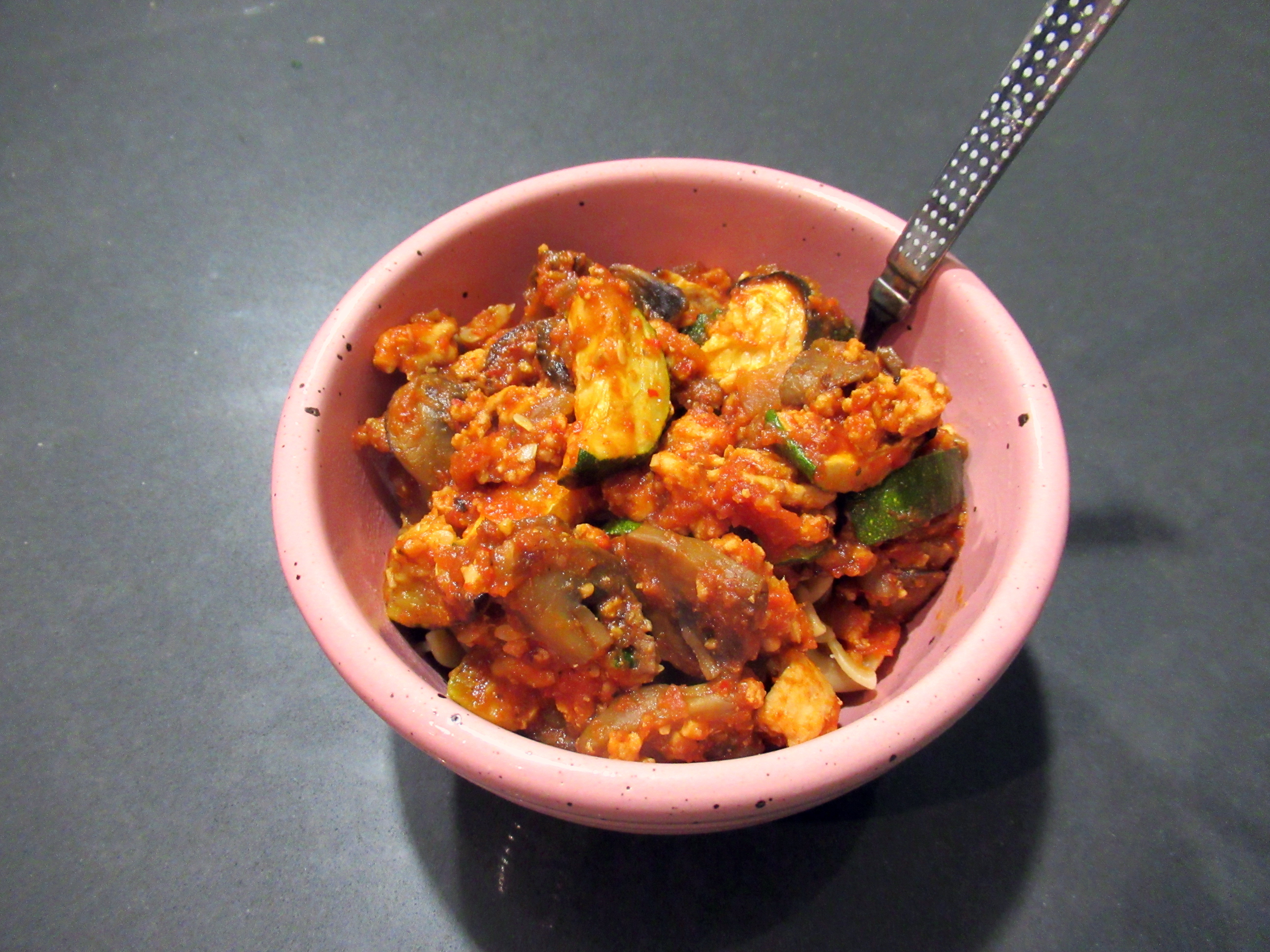 Giant pasta bowls – whole-wheat rotini // garlic marinara sauce zhuzhed up with more garlic, fish sauce, and spices // ground turkey // caramelized mushrooms and onion // roasted zucchini.