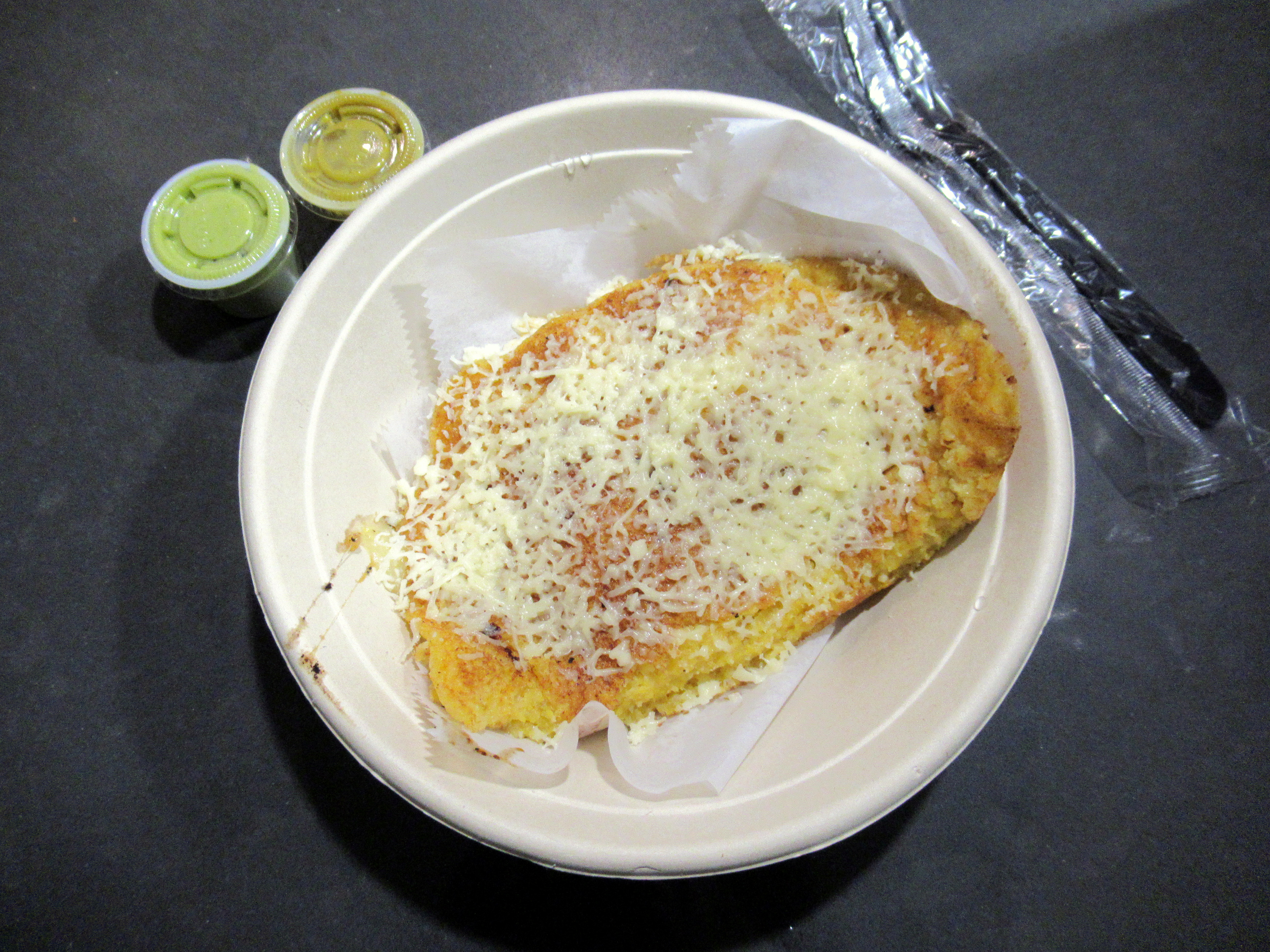 Venezuelan take-out from White Maize. I got a sweet corn pancake stuffed with cheese and shredded chicken.