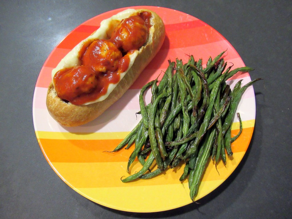 Meatball subs with roasted green beans. Turkey meatballs – stuffed with garlic, fish sauce, and urfa chili peppers – tossed in marinara sauce on a toasted hoagie roll with mozzarella. Our sandwiches were comically large but neither of us could stop from finishing them because they were so yummy!