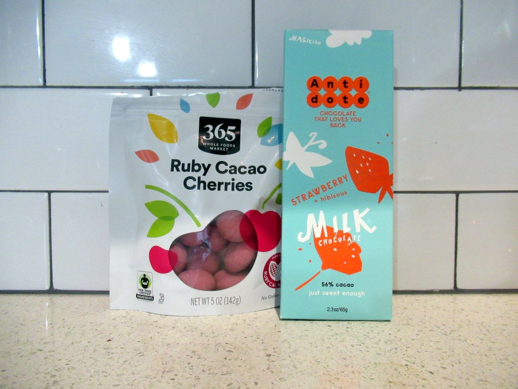 Ruby cacao covered cherries + strawberry and hibiscus chocolate.