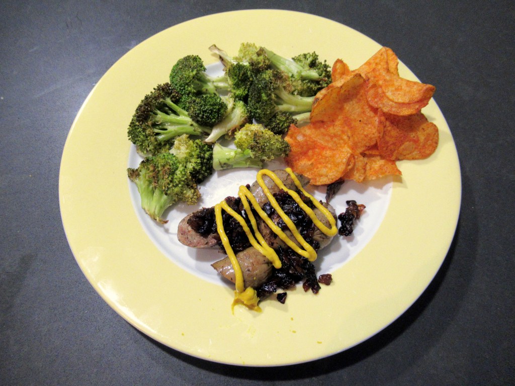 Wild mushroom chicken sausages – topped with caramelized onion and yellow mustard / roasted broccoli / Lays chili chips.