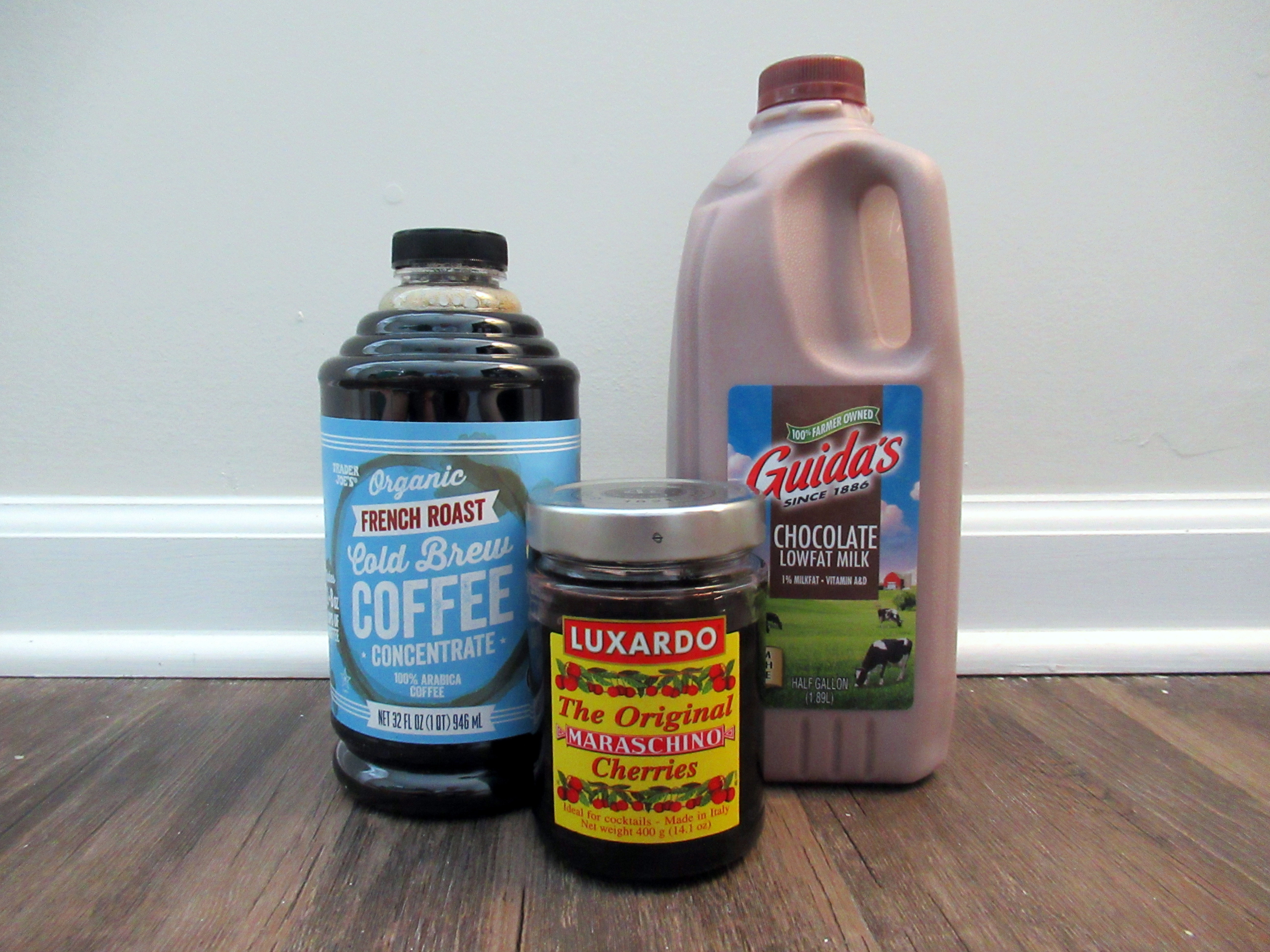 Chocolate cherry coffee = Trader Joe’s cold brew, luxardo cherries, chocolate milk.