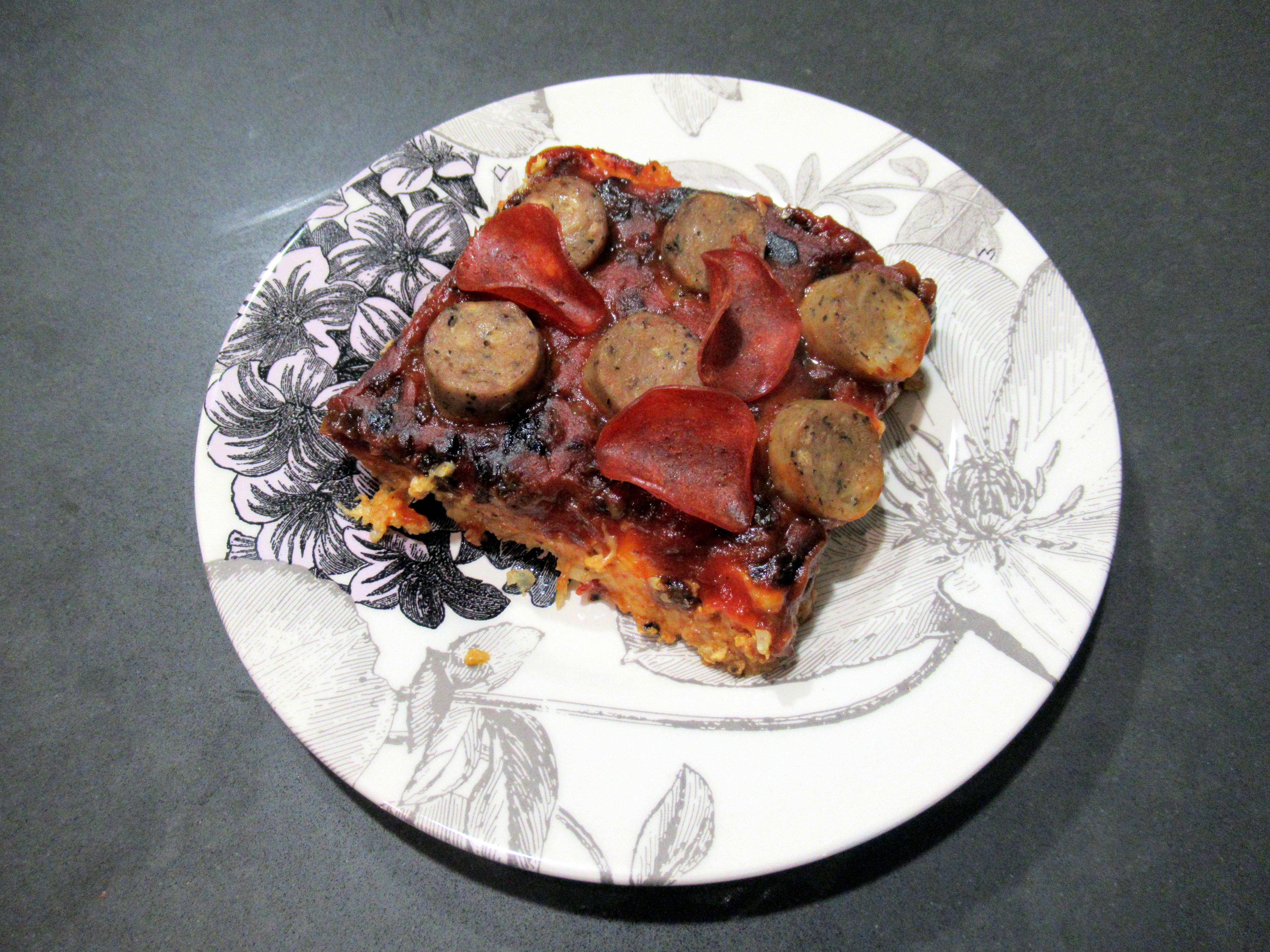 Pizza casserole. I made a crust layer out of riced cauliflower (with spices, eggs, and cheese), topped with mozzarella, marinara sauce and caramelized onions, chicken sausage, and turkey pepperoni.
