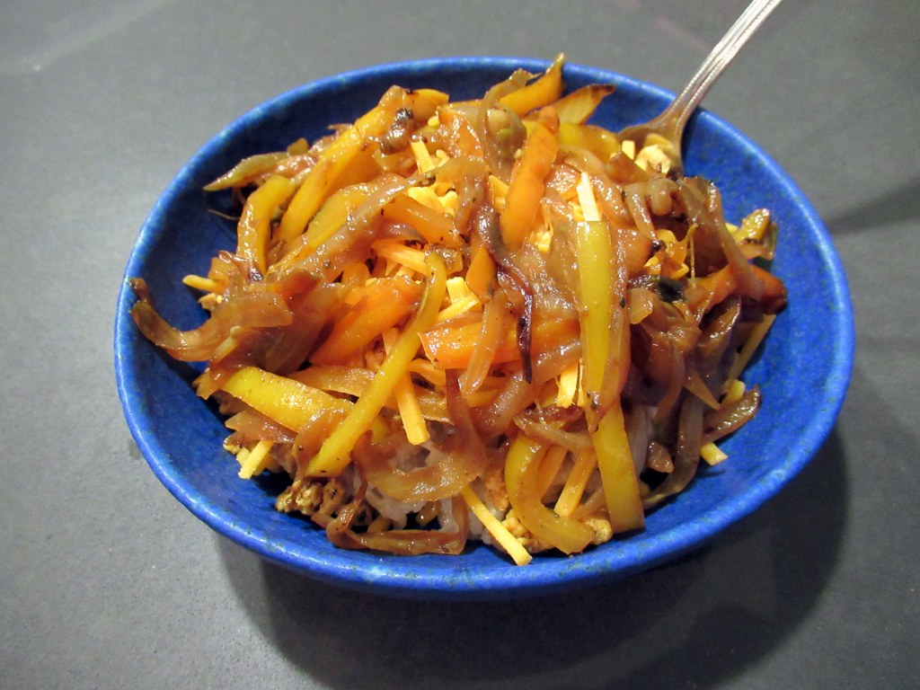 Homemade taco bowls. Brown basmati rice / ground turkey / sharp cheddar / sautéed orange and yellow bell pepper and onion.
