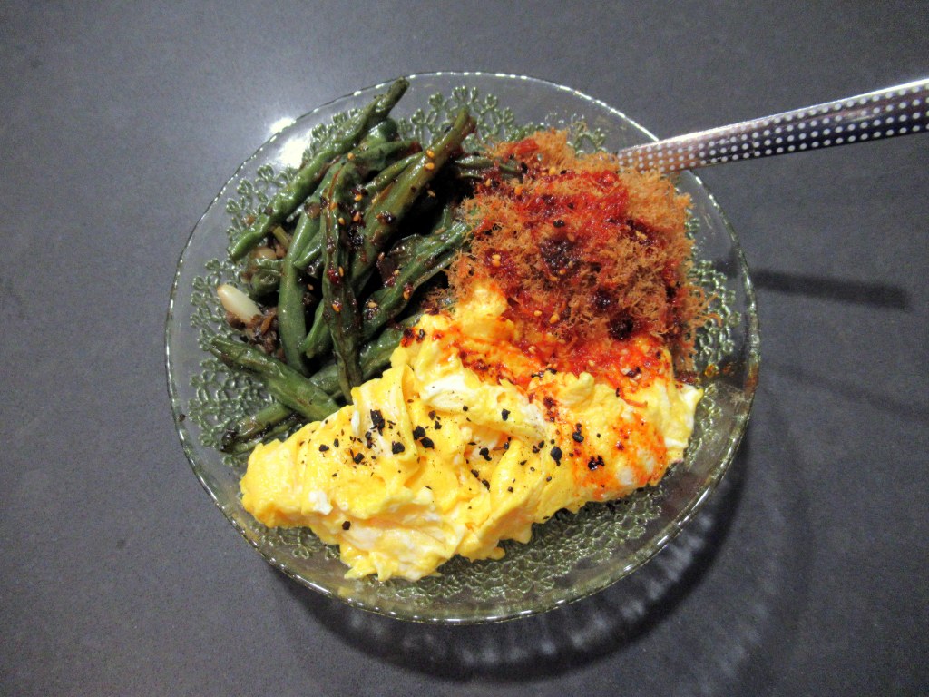 Leftover Thai green beans with soft-scrambled eggs, vegetarian pork floss, and chili oil.