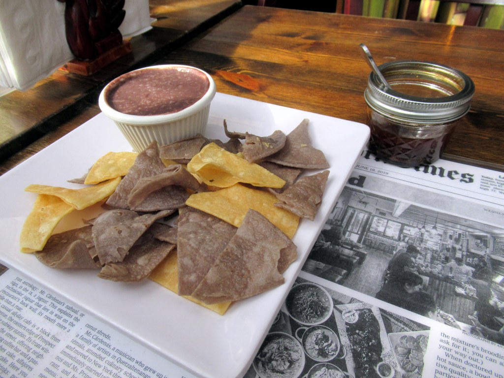 Chips with bean dip and crazy-good housemade hot sauce.