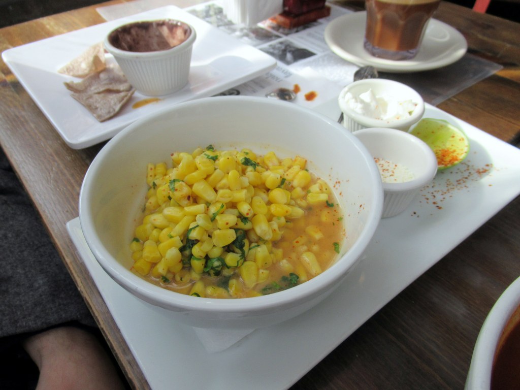 Corn with cotija cheese, sour cream, cilantro, and chile.