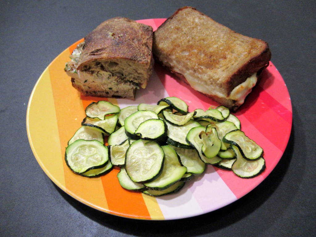 Take-out dinner from Winner, plus roasted zucchini. We split a smoked chicken salad sandwich and a grilled cheese with cheddar, provolone, and romesco sauce on sourdough.