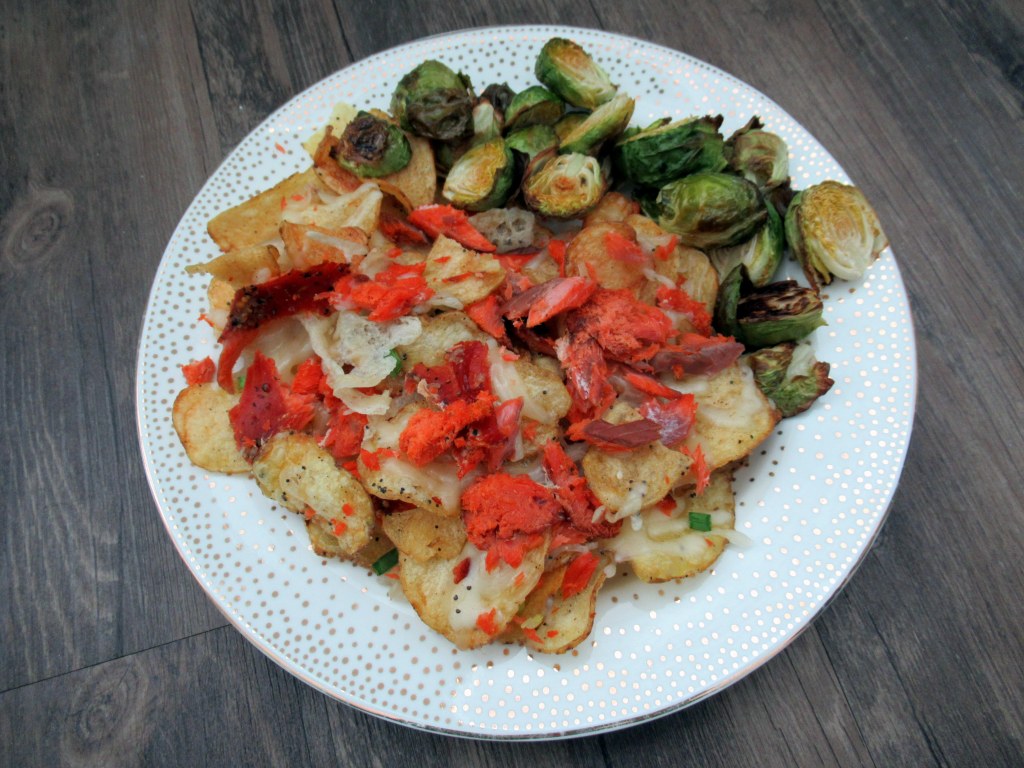 Loxchos(!!) with roasted brussel sprouts. Trader Joe’s everything bagel seasoning chips with swiss and Gruyere, hot-smoked salmon, and green onion.