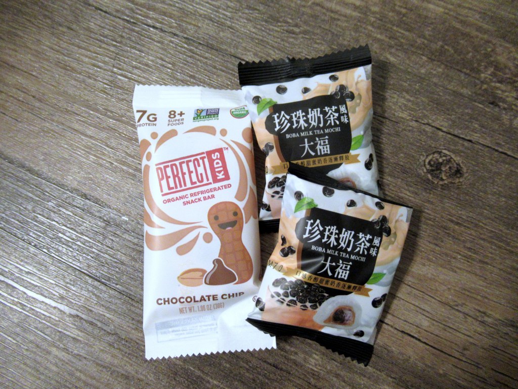 Peanut butter chocolate chip Perfect Bar + boba milk tea mochi.
