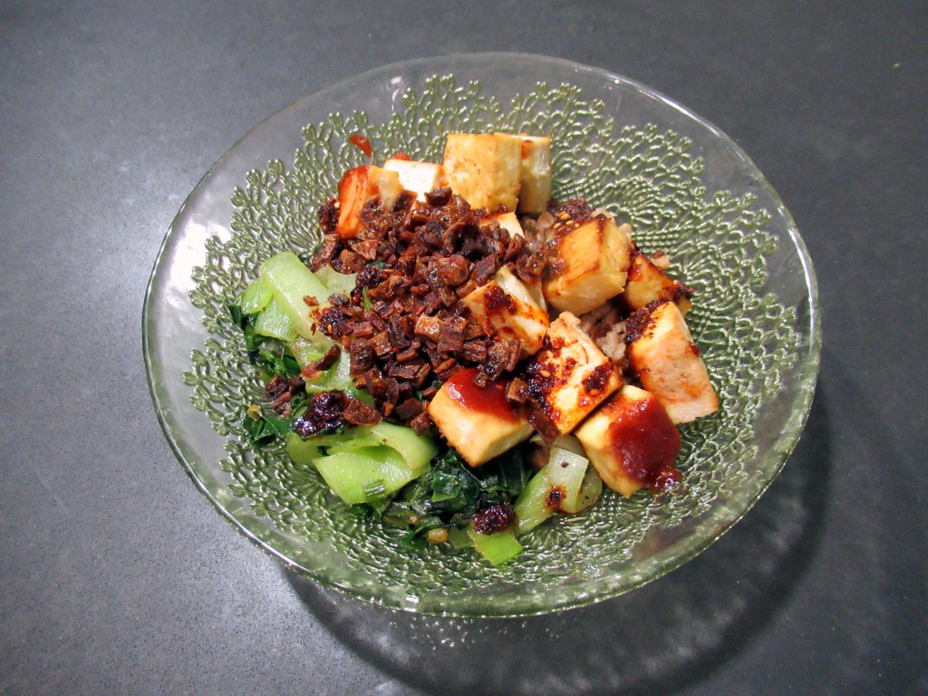 Farro / glazed, baked tofu / sautéed bok choy and green onion / chili crisp / fried shallots (which we made in the microwave!!).