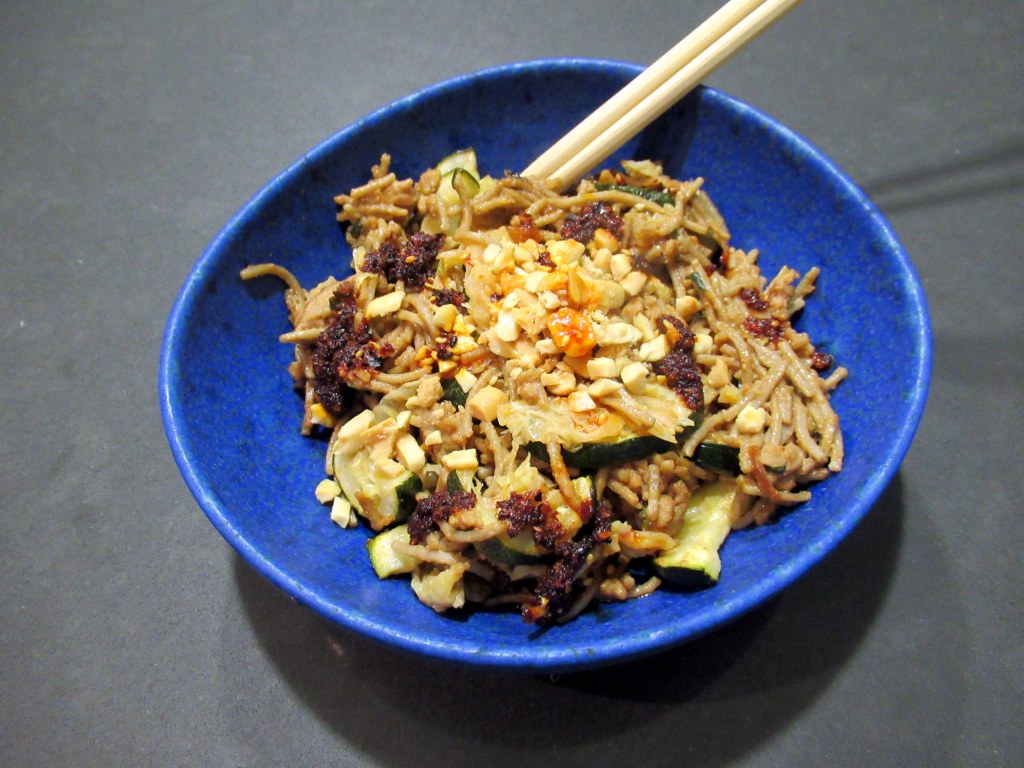 Soba noodles / peanut sauce (loosely based on this one) / cabbage / zucchini / ground turkey / chili crisp and smashed peanuts.