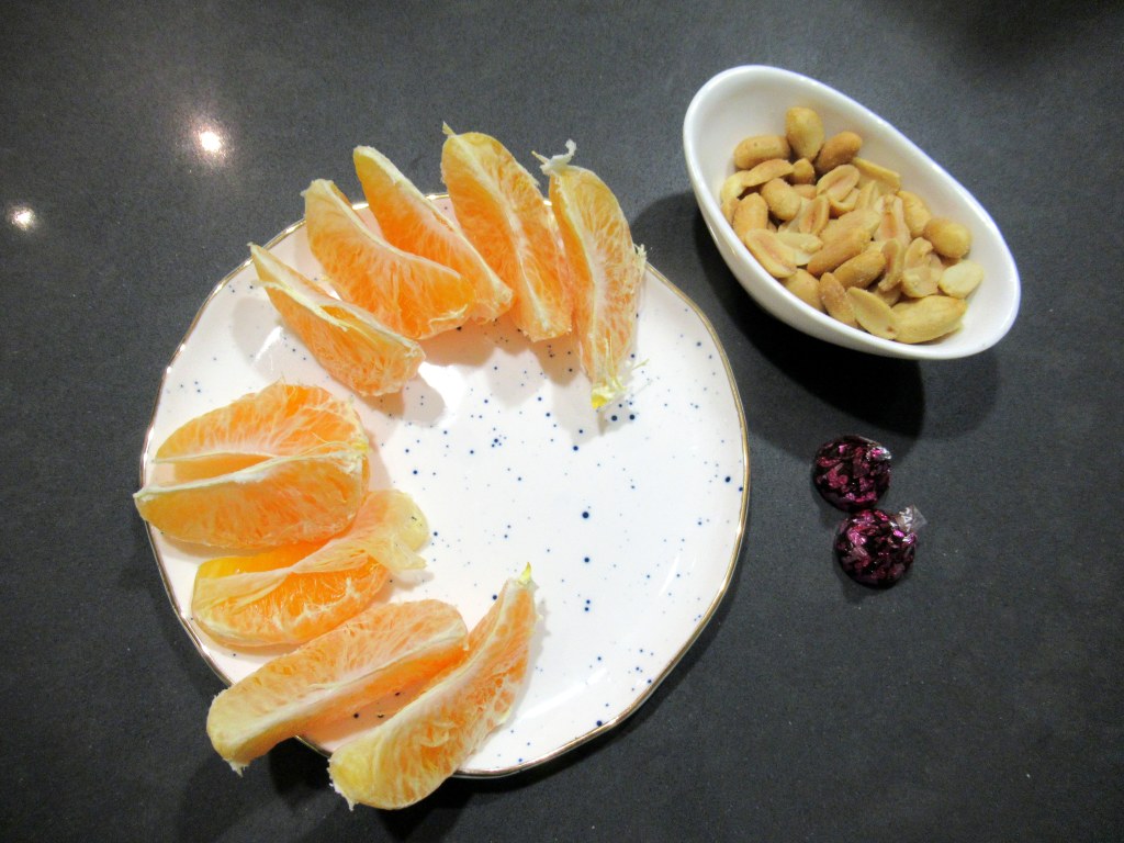 An ideal snack array – sumo mandarin, salted peanuts, and lava cake kisses.