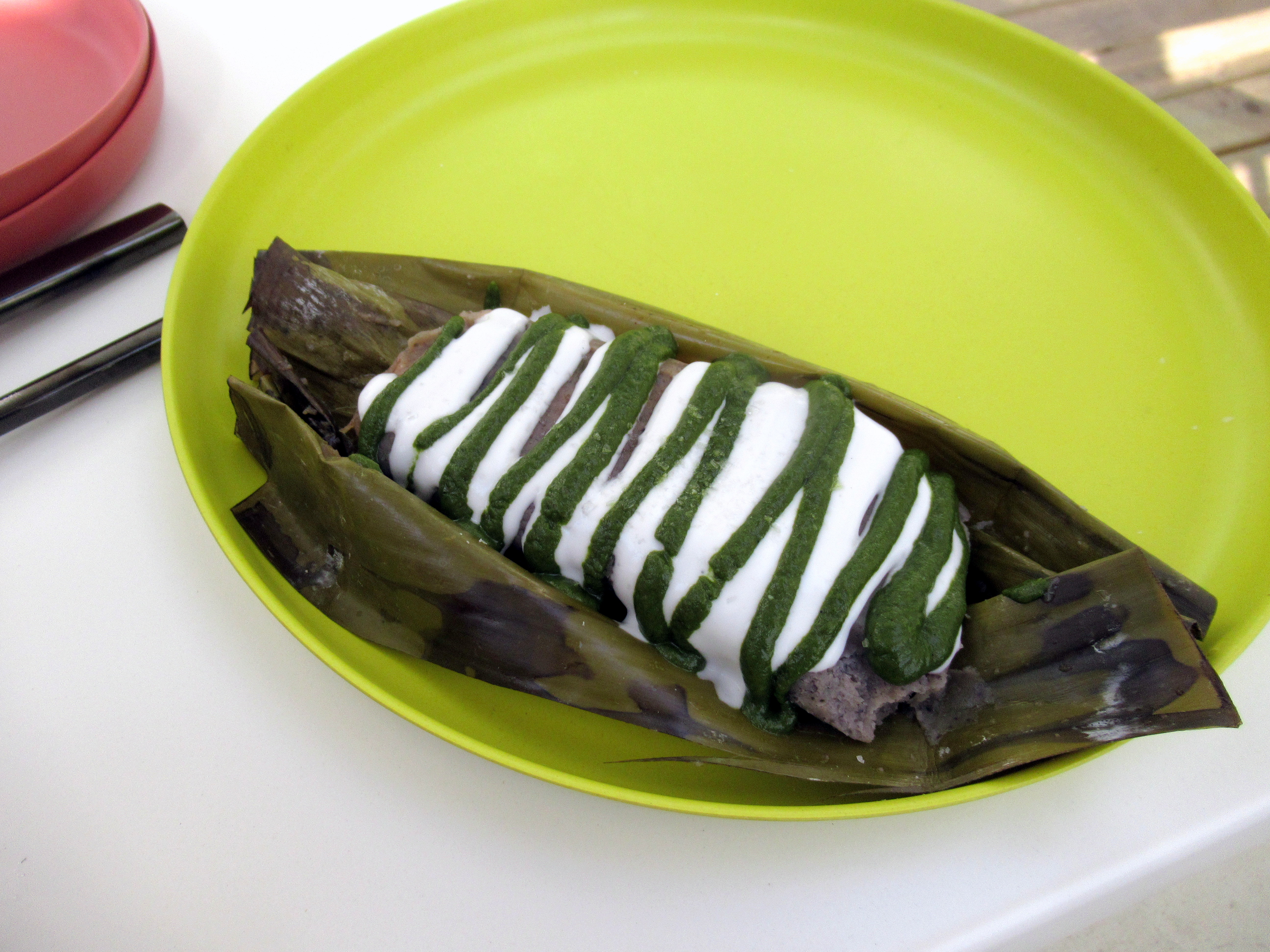 Heirloom corn tamal, stuffed with sweet potato al pastor, and topped with smoked crema and poblano rajas.