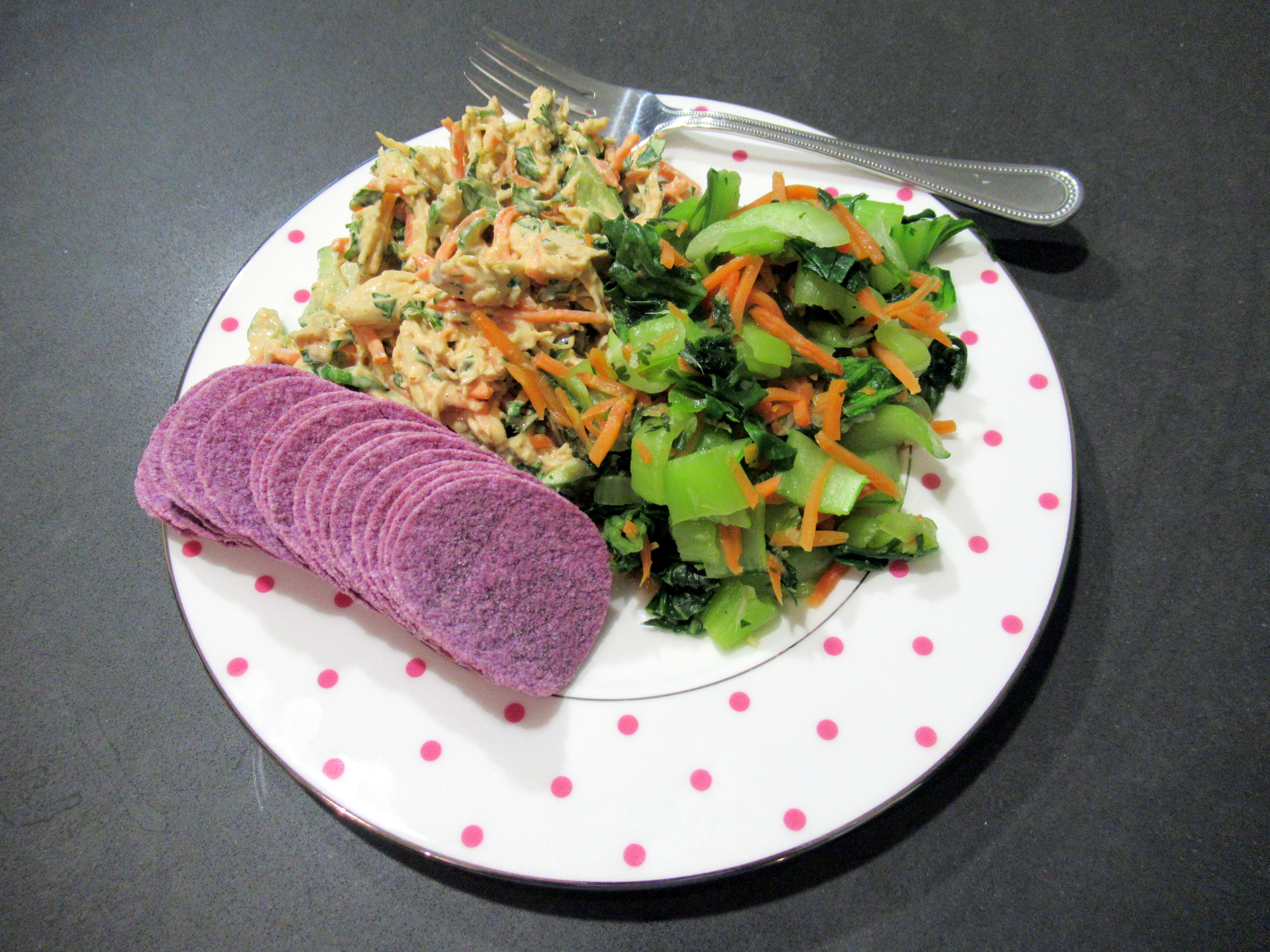 Bahn mi chicken salad with bok choy with ginger and carrot plus taro coconut chips.