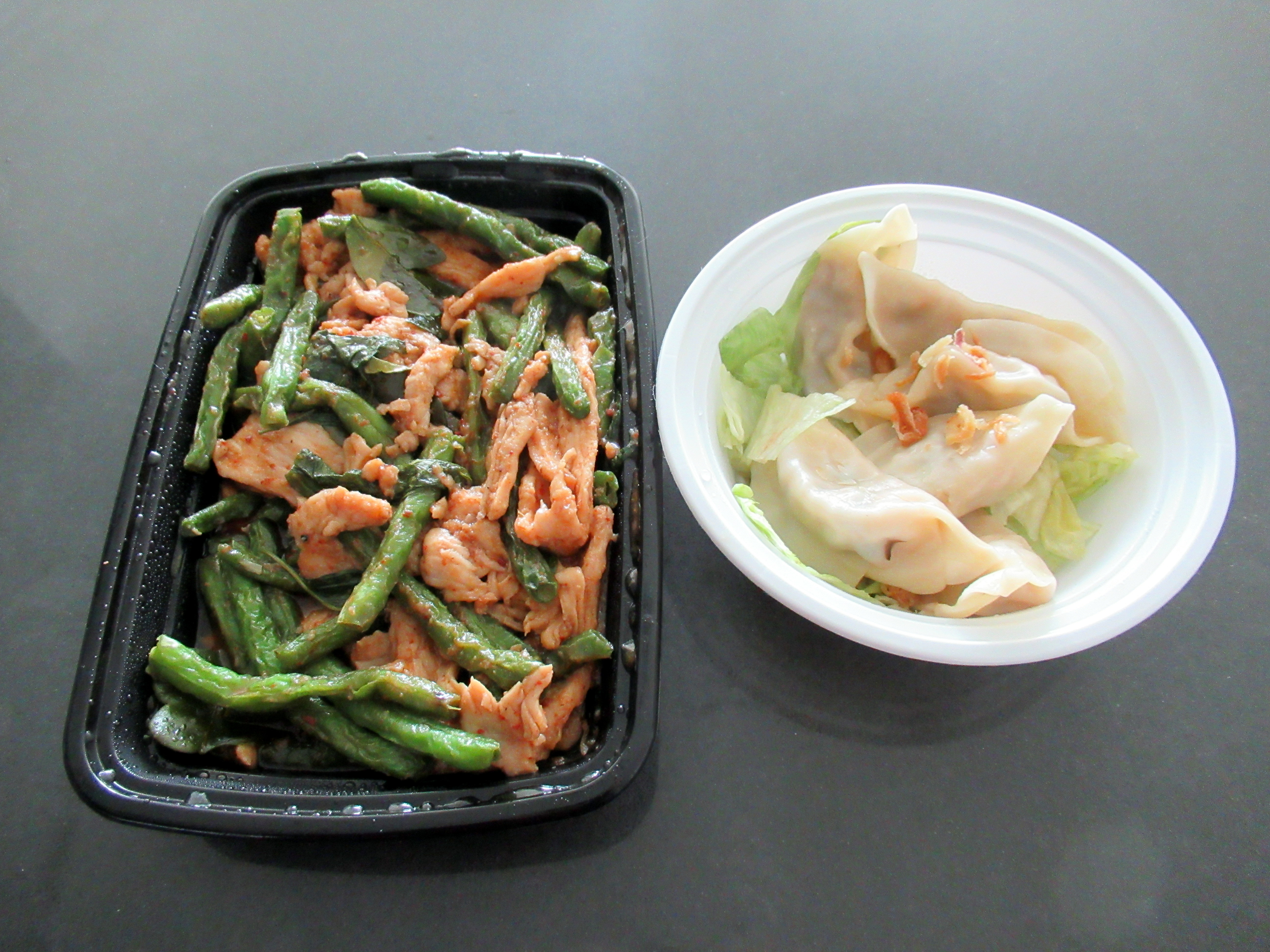 Thai take-out night – spicy chicken and long beans with veggie dumplings.