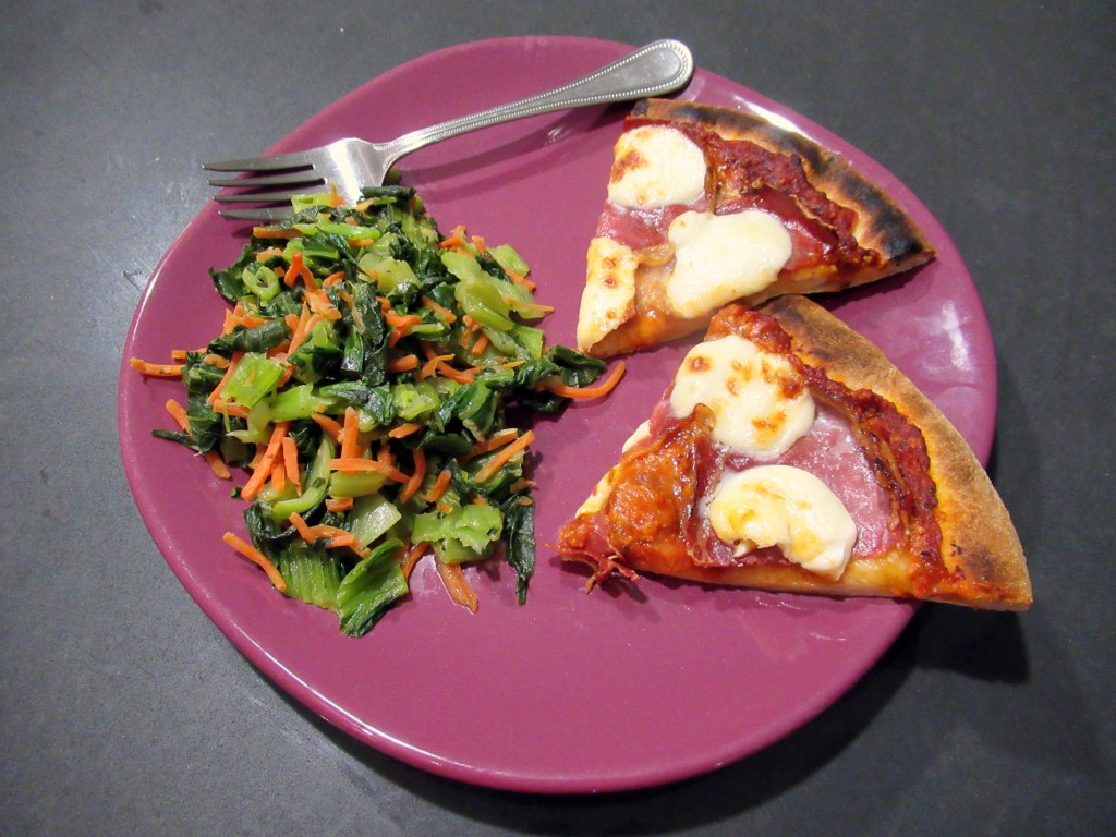Leftover bok choy with the best pizza we’ve ever made. Just a frozen crust topped with tomato sauce gussied up with tons of garlic, chili crisp, and olive oil plus baby mozzarella and bresaola.