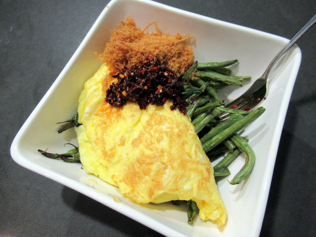 Roasted green beans with eggs, vegan pork floss, and chili crisp.
