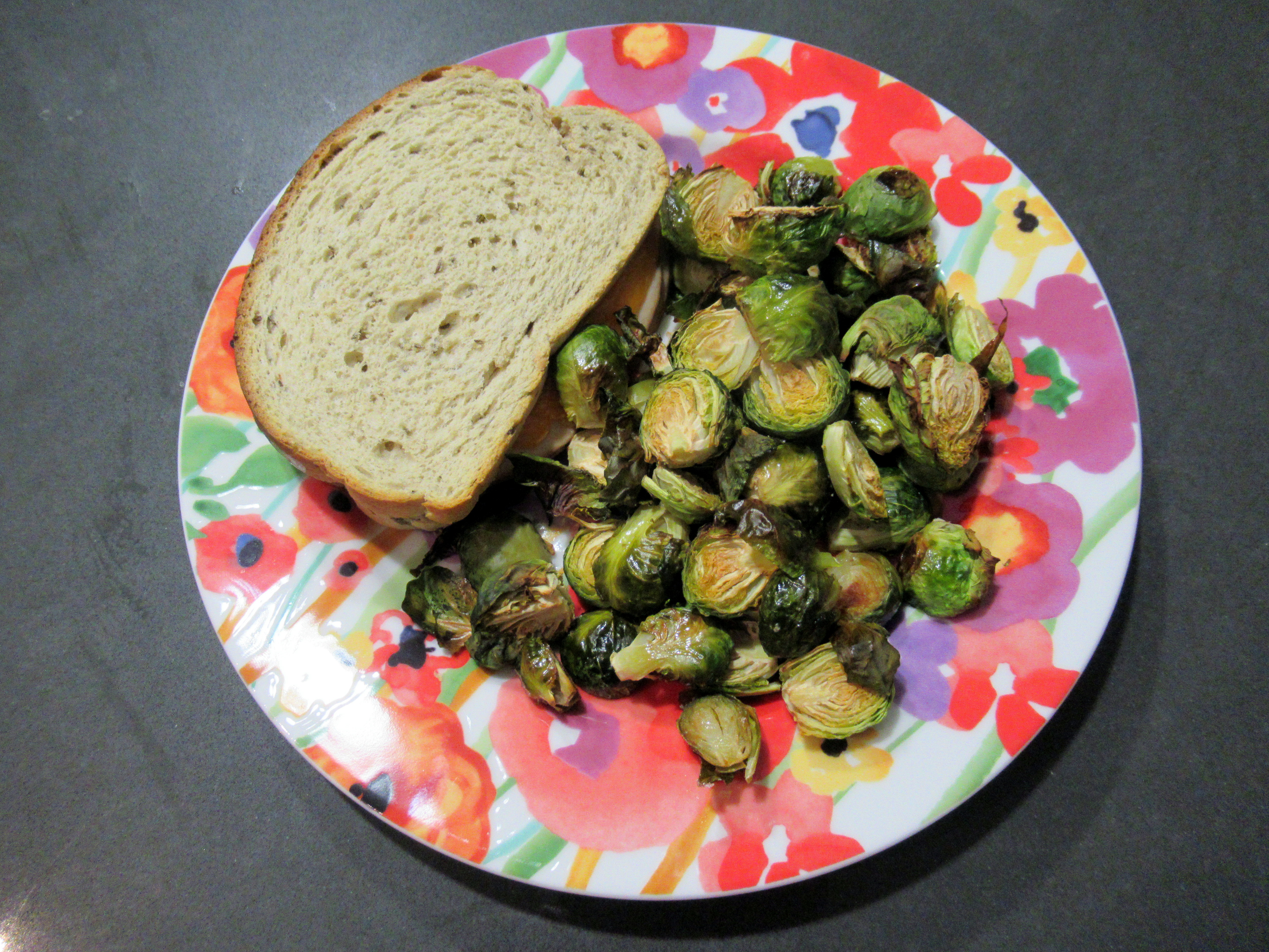 Turkey and cheddar sandwich (with black garlic mayo!) on toasted rye with roased brussel sprouts.