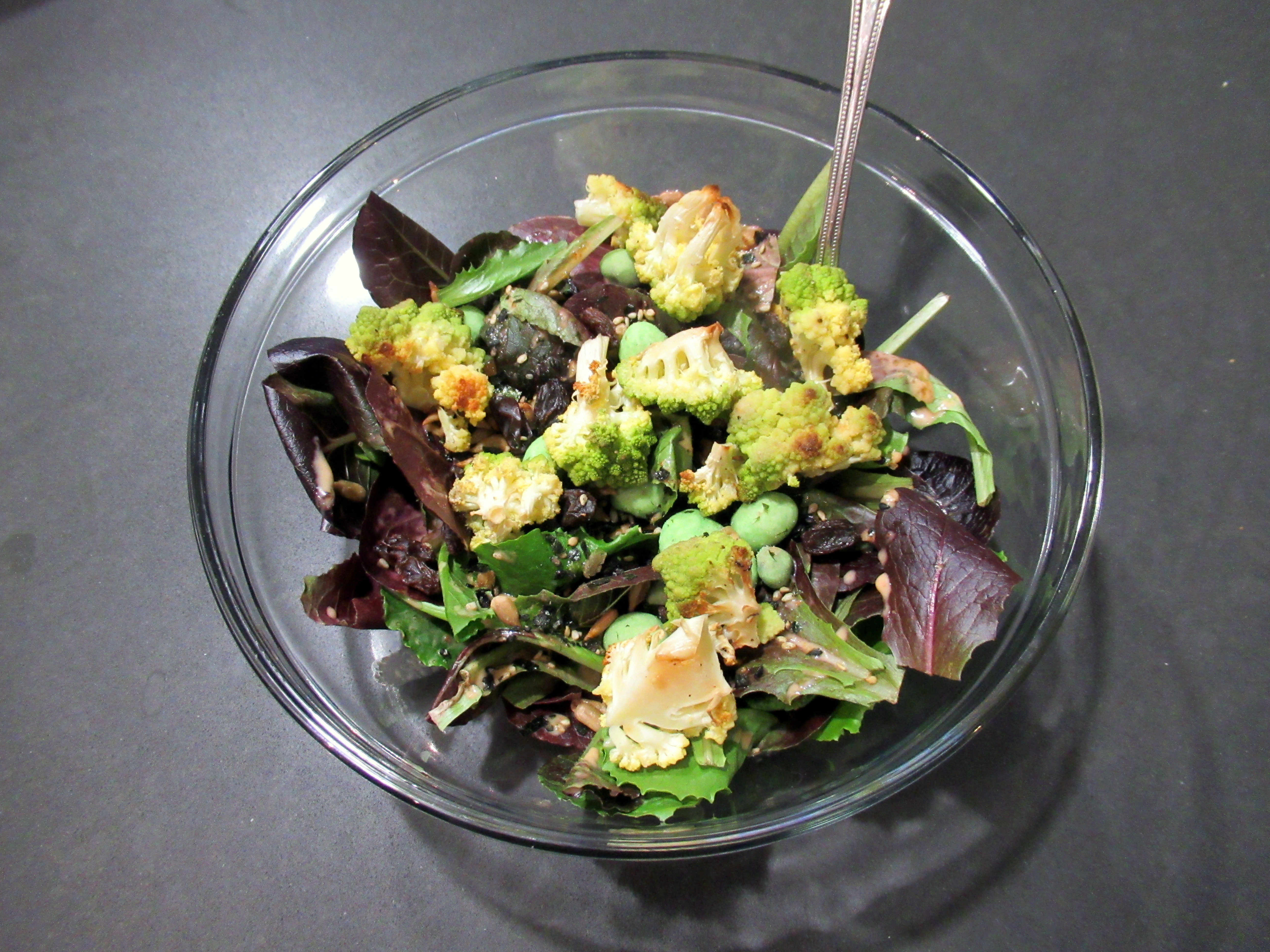 An eclectic salad. Baby romaine with sriracha-mayo dressing, wasabi peanuts, sesame seeds, yellow raisins, and leftover romanesco.