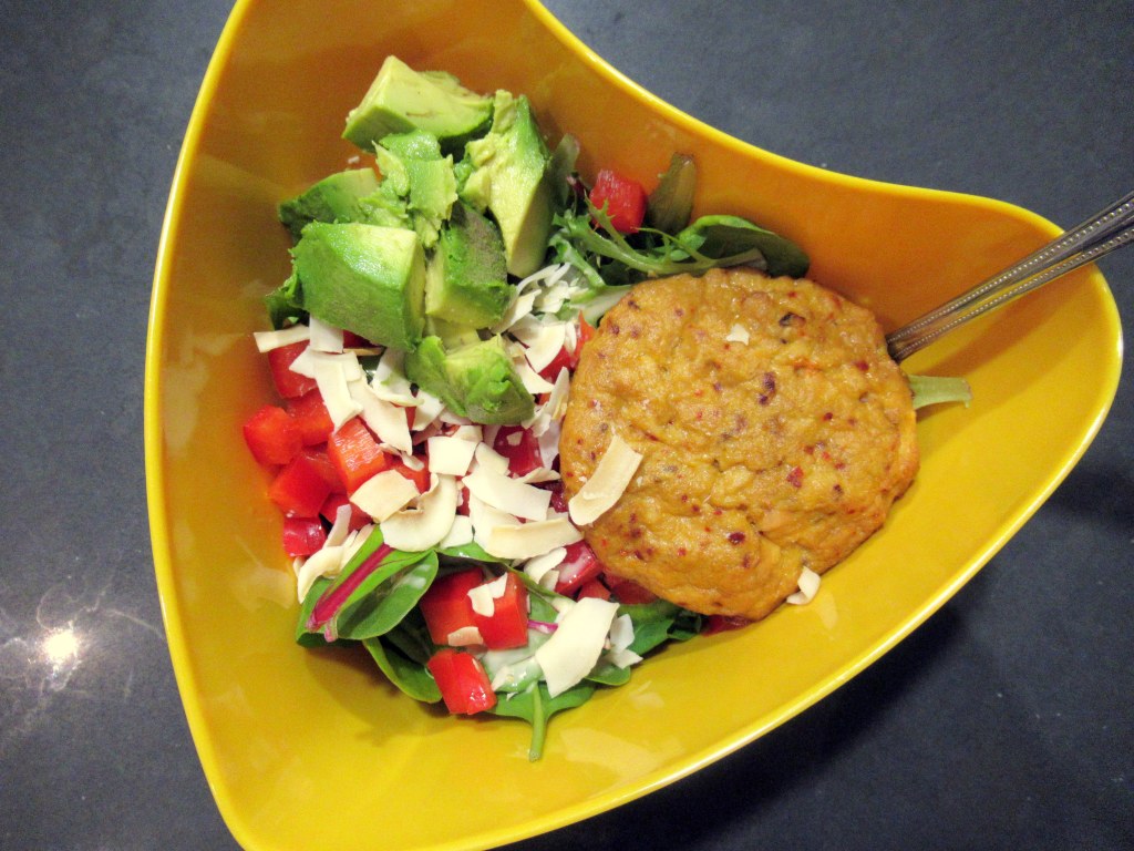Salad night – baby spinach and spring mix blend with green onion, red bell pepper, avocado, coconut chips, roasted garlic salmon cakes, and homemade creamy passionfruit vinaigrette.